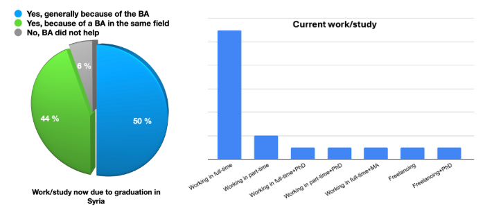 A degree from Syria has a positive impact on the post-migration academic or career path of 94% of the Syrian respondents. In addition, 44% worked or studied because they had a BA in their particular field (disciplinary path), while 50% expressed that having a BA in general helped in shaping their future, indicating that they followed interdisciplinary paths by working or studying in other fields.
