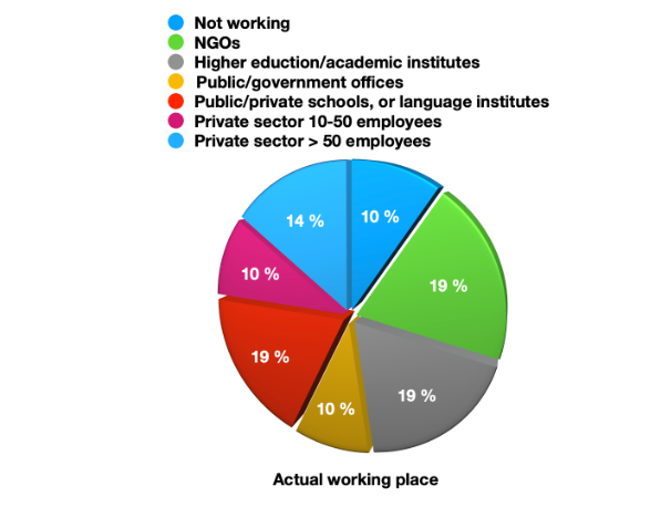 Most respondents (24%) said they were working in the private sector at the time of filling out the survey, either in large companies with more than 50 employees or in companies with less than 50 employees. Three types of employment were equally represented among respondents (19% each): working in higher education institutions; working in public or private schools; and working for NGOs or UN organisations.