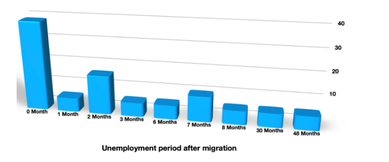 - Some respondents directly started working/studying after migrating, while most respondents were able to start studying or working within one year after migration.