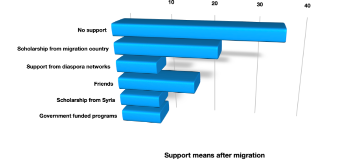 The majority of respondents received some kind of support in the country where they live, this varied from scholarships (from home country or from destination country) to support from government programs or diaspora networks and societies in the country where they are living. However, 35% said that they received no support.